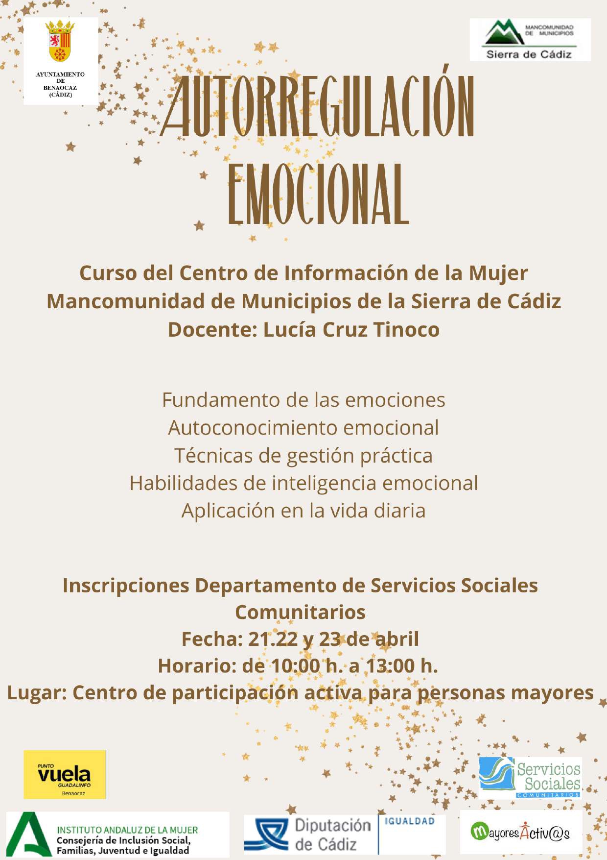 Impartido por Lucía Cruz Tinoco, el curso abordará contenidos como el autoconocimiento emocional, técnicas prácticas de gestión y el desarrollo de habilidades de inteligencia emocional aplicadas a la vida diaria.
