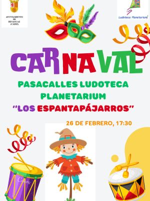 El Ayuntamiento de Benalocaz te invita a celebrar el Carnaval 2026 con el pasacalles de la Ludoteca Planetarium, titulado “Los Espantapájaros”.
