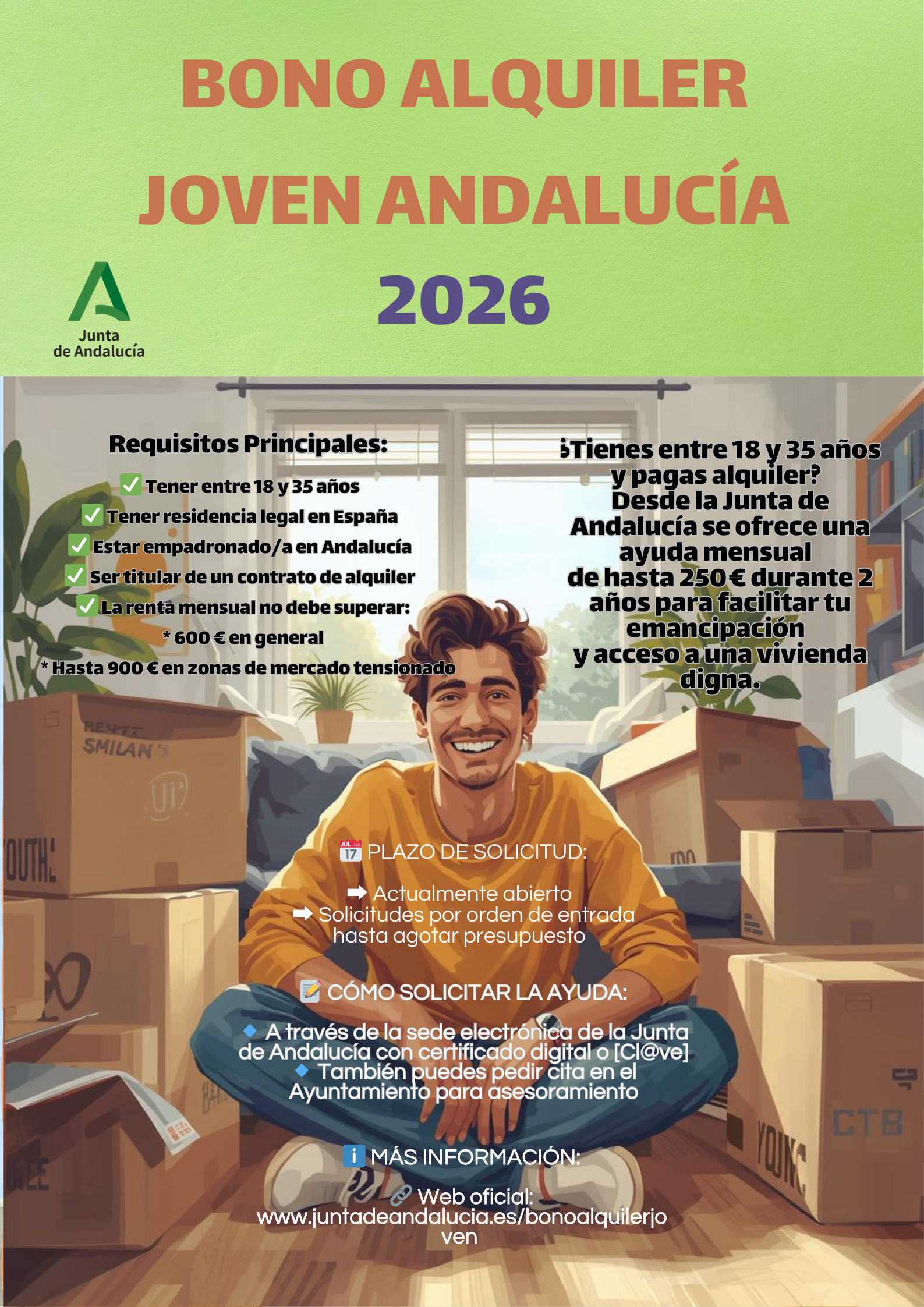 ¿Tienes entre 18 y 35 años y pagas alquiler? Desde la Junta de Andalucía se ofrece el Bono Alquiler Joven 2026, una ayuda mensual de hasta 250 € durante 2 años para facilitar tu emancipación y acceso a una vivienda digna.