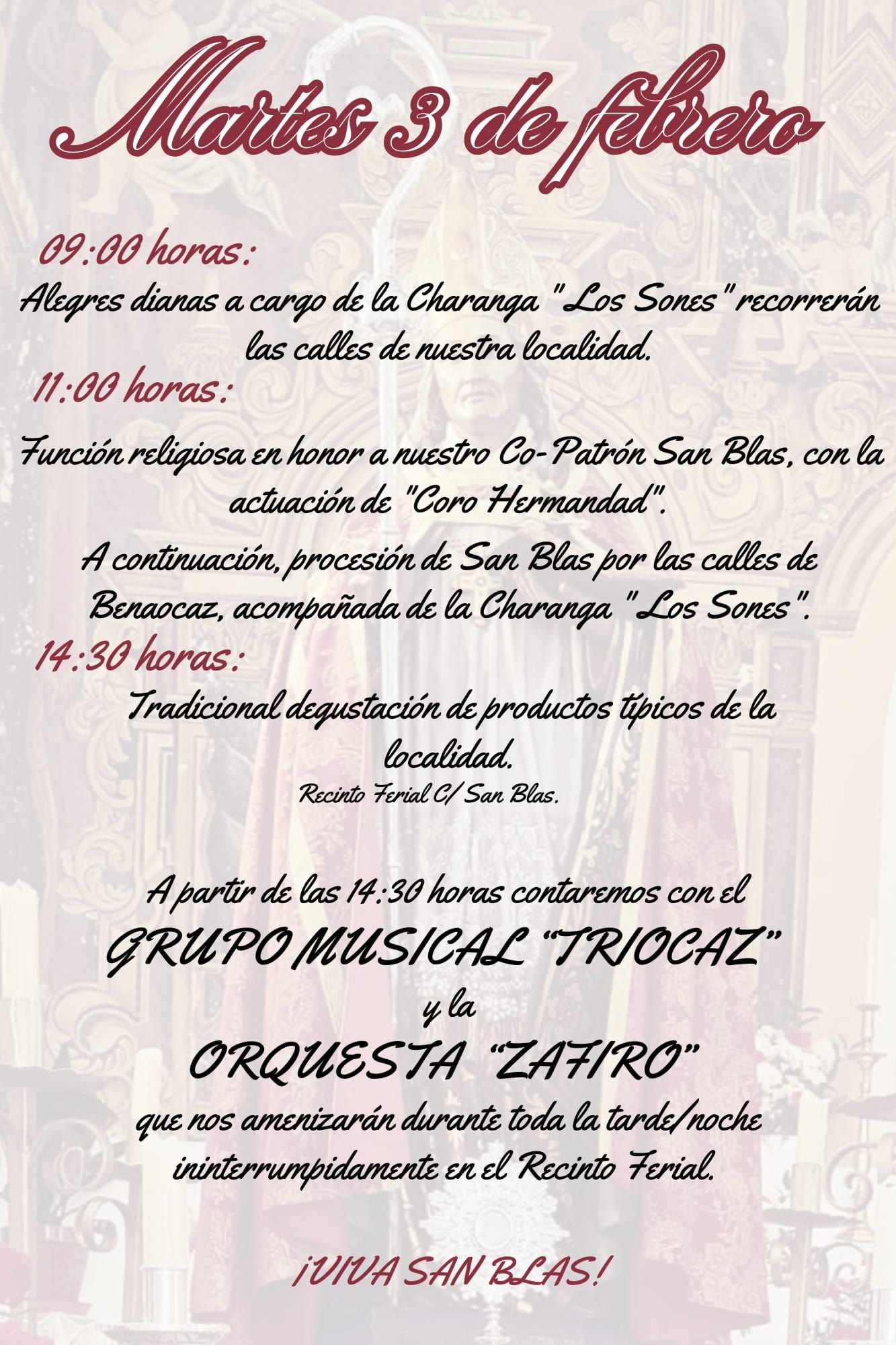 Los actos comenzarán a las 09:00 horas con las alegres dianas a cargo de la Charanga “Los Sones”, que recorrerá las calles del municipio. A las 11:00 horas tendrá lugar la función religiosa en honor a San Blas, con la actuación del Coro Hermandad, seguida de la tradicional procesión por las calles de Benaocaz, acompañada igualmente por la charanga.