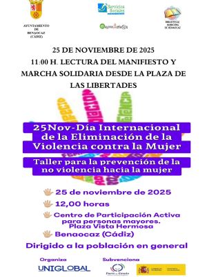El Ayuntamiento de Benaocaz, junto con los Servicios Sociales, la Biblioteca Municipal y el programa Mayores Actív@S, invita a toda la ciudadanía a participar en los actos organizados con motivo del Día Internacional de la Eliminación de la Violencia contra la Mujer.